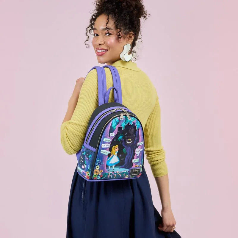 Fall down the rabbit hole of style with this mini backpack! Alice tries to make her way through Wonderland on the front of this bag.