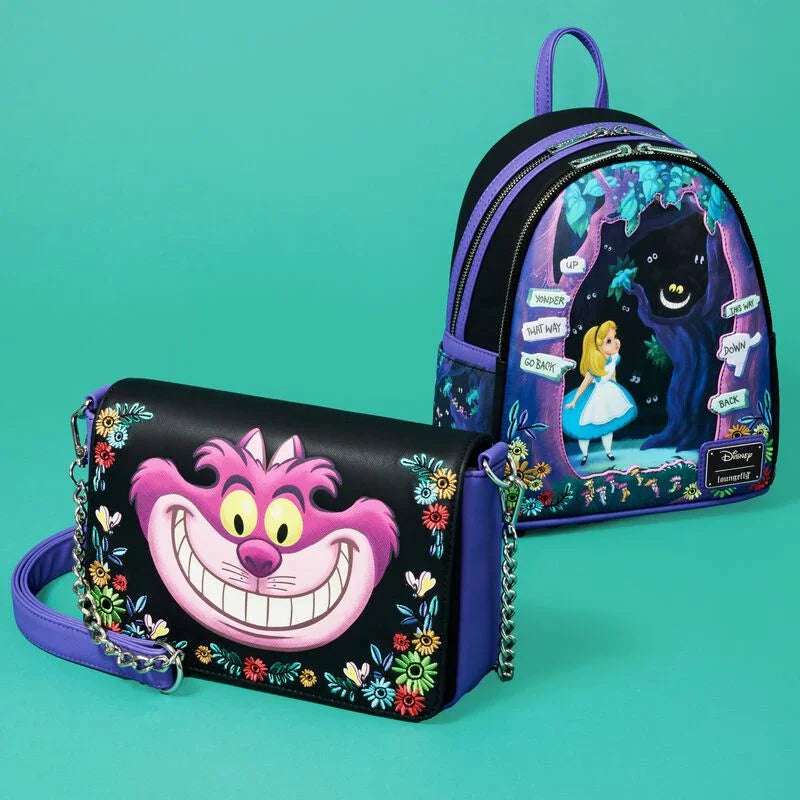 Shift the bag back and forth and the Cheshire Cat appears and disappears in a lenticular feature. Visuals of Wonderland appear around Alice on the front and across the side pockets.