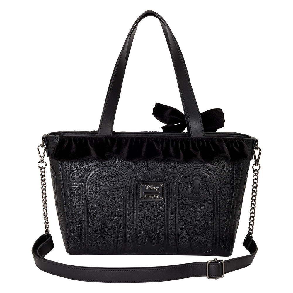 This tote bag is the Disney Villain fashion statement you've been looking for. This bag features a velvet ruffle along the top. Below, you'll find stained-glass-style windows with 3D embroidery that depicts your fav Disney Villains. Metallic faux leather and a velvet bow bring the whole look together.