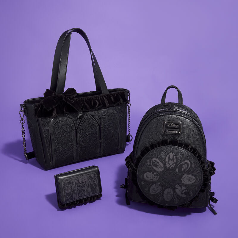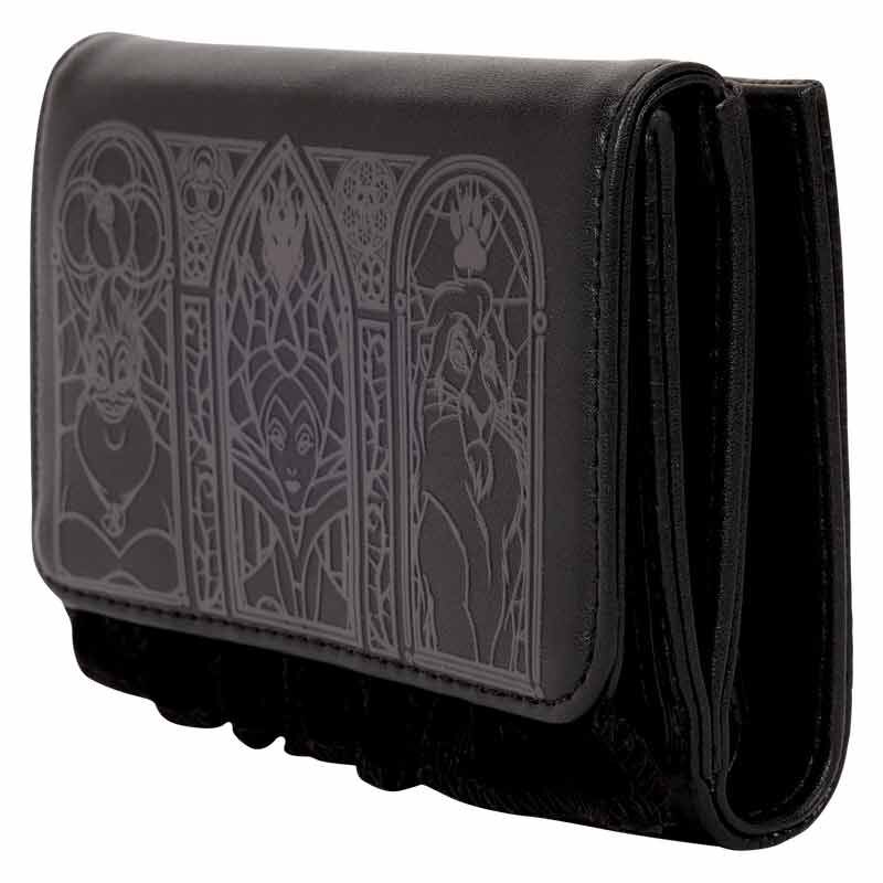 The front of this wallet features a design with three stained-glass windows featuring Ursula, Maleficent, and Scar. Velvet accents and shimmer embroidery elevate the look. Inside, there are five card slots and one clear slot for an ID.