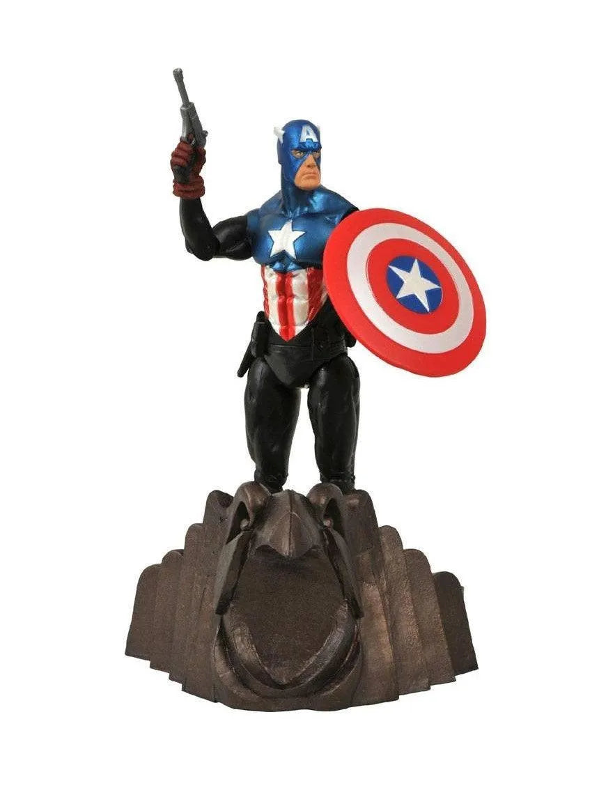 Featuring the birth of a new legend, the next piece in the illustrious Marvel Select line is none other than the all-new Captain America! Showcased in Captain America #34, join James Buchanan "Bucky" Barnes as he picks up where Steve Rogers left off and proves that no matter what, Captain America can never die. Sculpted by Sam Greenwell with 14 points of articulation, this 7" hero also includes a wall-mountable cityscape base!