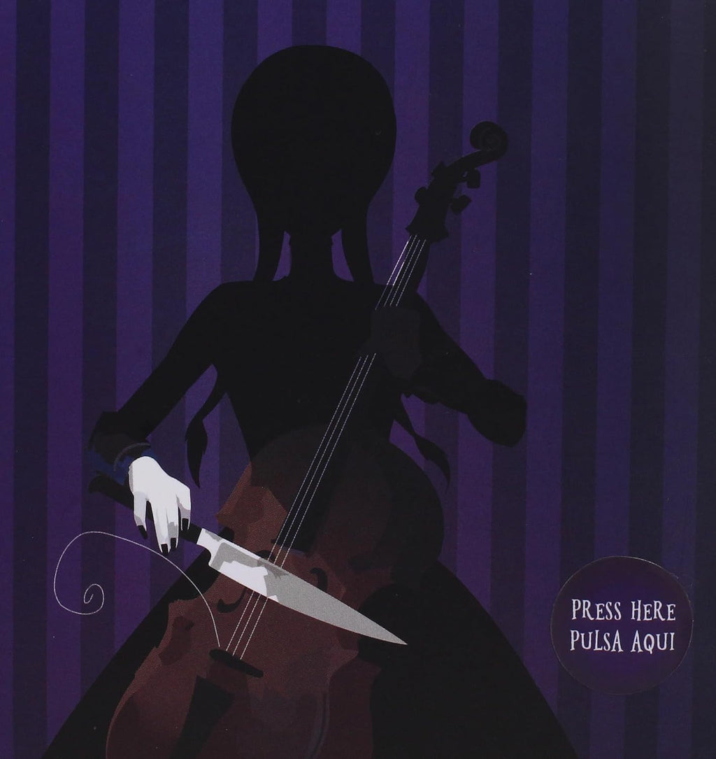 - This A5-sized notebook features a design inspired by Wednesday Addams, depicting her silhouette playing the cello with a knife in front of a stained-glass window.