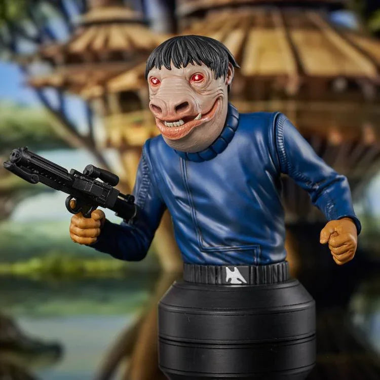 Having been exclusively available in the Sears Cantina Adventure Set, the blue Snaggletooth was somewhat of a rarity for vintage action figure collectors. Now he's the newest 1/6 scale bust in the Star Wars line! This approximately 5" bust shows the Snivvian with his blaster drawn and is limited to only 2000 pieces. It comes packaged in a full-color box with a numbered certificate of authenticity. Designed by Leo Silv and sculpted by Gentle Giant's in-house team of professional artists.