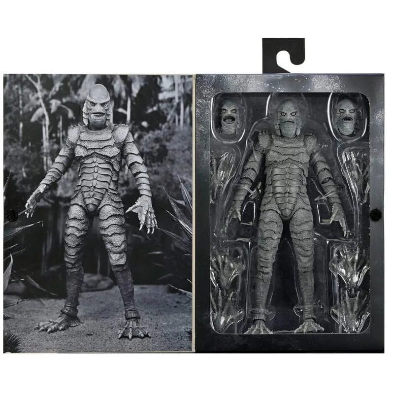 The debut of Universal's 1954 film The Creature from the Black Lagoon took audiences deep into the Amazon! This 7" scale Ultimate action figure depicts the mysterious and terrifying Gill-man in extraordinary detail in classic silver screen black and white deco. It comes with three extra pairs of hands, and three interchangeable head sculpts (one with an articulated jaw), Display-friendly window box packaging with opening front flap.