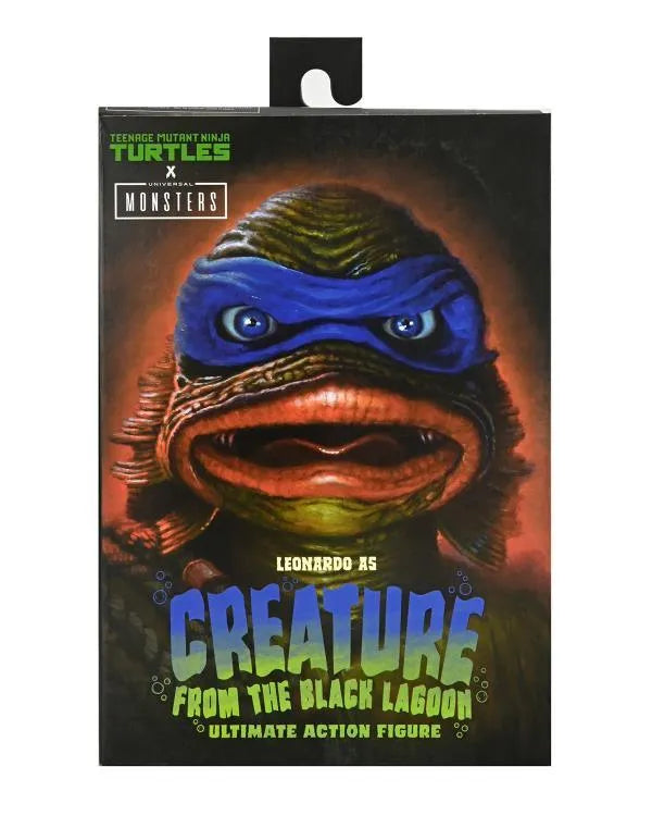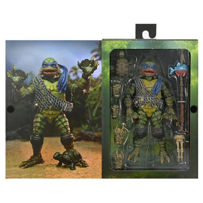 This 7" scale action figure reimagines Leonardo as the mysterious Creature from the Black Lagoon, and he's packed to the gills with accessories! This fully articulated figure includes two harpoon katanas (one with fish), pet turtle, attachable wrist bone blades, and interchangeable hands. Comes in collector-friendly window box packaging with opening flap featuring an all-new illustration by Daniel Horne.